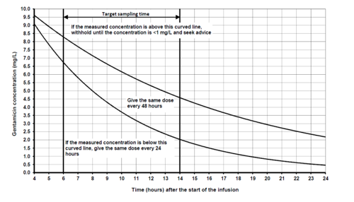 • If CrCl is <21ml/min take a blood sample 24 hours after the start of the gentamicin infusion and ONLY give a further dose once the measured concentration is <1mg/L, the dosing graph does not apply.