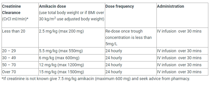 Amikacin MUST only be used on microbiology advice. This policy is intended for the treatment of Gram negative infections. If amikacin is being used for the treatment of mycobacterial infection, discuss with pharmacy or an infection specialist (micro or ID consultant) for dosing advice.