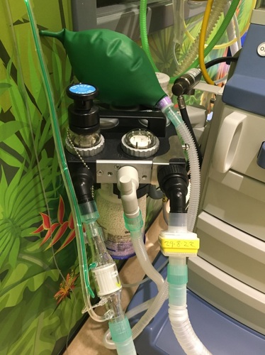 If a t-piece is required, it can be set up in advance & passed through the wave guide, but the user will be in scan and the selection of breathing system is in the control room, so it requires additional personnel & potentially awkward communication so it is recommended that the manual ventilation bag on the circle is used whenever possible.