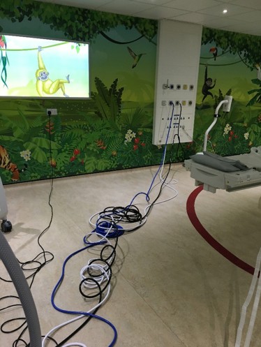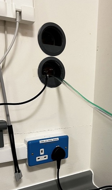 The Nitric delivery system should go through the lower wave guide (pass the tubes from the scanning room backwards towards the machine – they don’t fit the other way round). Blue plugs are for medical equipment, plug the nitric delivery system in here.