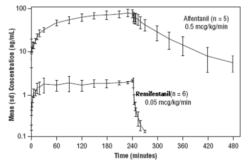 The pharmacokinetics of Alfentanil can be described as a three-compartment model with initial distribution t½ of 1 and 14 minutes; and a terminal elimination t½ of 90-111 minutes.