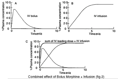 It takes 3.3 half lives of a drug infusion to reach 90% of steady state concentration and 5 half lives to reach 97% of the final steady state concentration. In morphine’s case this would take some 6-10 hours. The use of a bolus dose allows the steady state to be reached more quickly as the infusion then merely has to maintain the drug concentration rather than building to a steady state (fig 2).