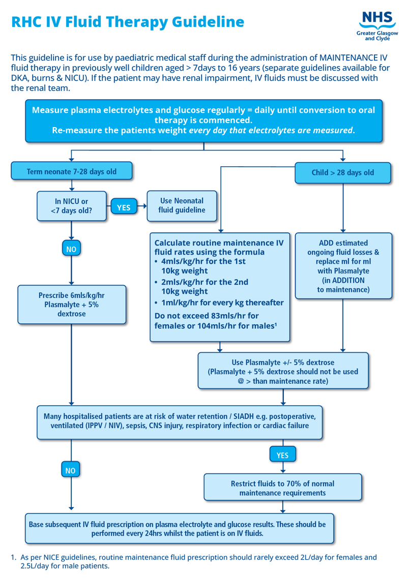 This guideline is for use by paediatric medical staff during the administration of MAINTENANCE IV fluid therapy in previously well children aged >7 days to 16 years (separate guidelines available for DKA, burns and NICU). If the patient may have renal impairment, IV fluids must be discussed with the renal team.