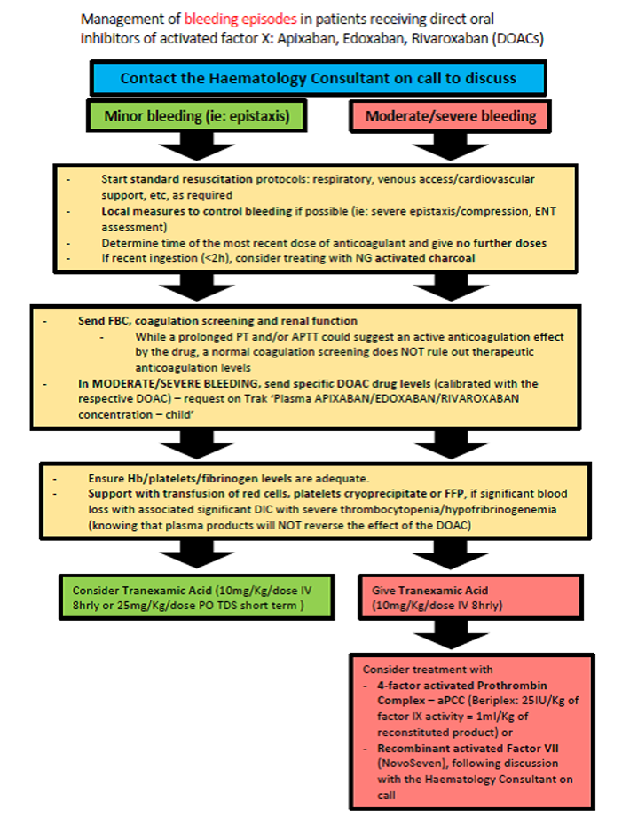 Management of bleeding episodes in patients receiving direct oral inhibitors of activated factor X: Apixaban, Edoxaban, Rivaroxaban (DOACs):