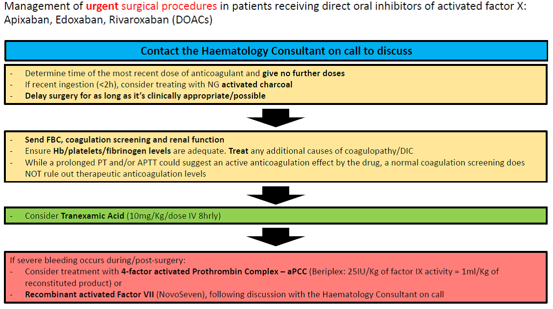Management of urgent surgical procedures in patients receiving direct oral inhibitors of activated factor X: Apixaban, Edoxaban, Rivaroxaban (DOACs):