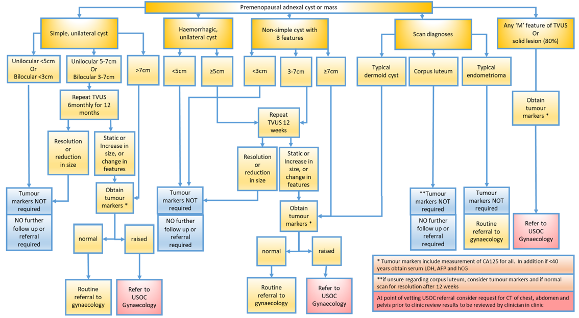 The referral pathways for ovarian pathology in premenopausal women is found in Table 2 and Table 3 below, with a summary flow diagram in Appendix 1.