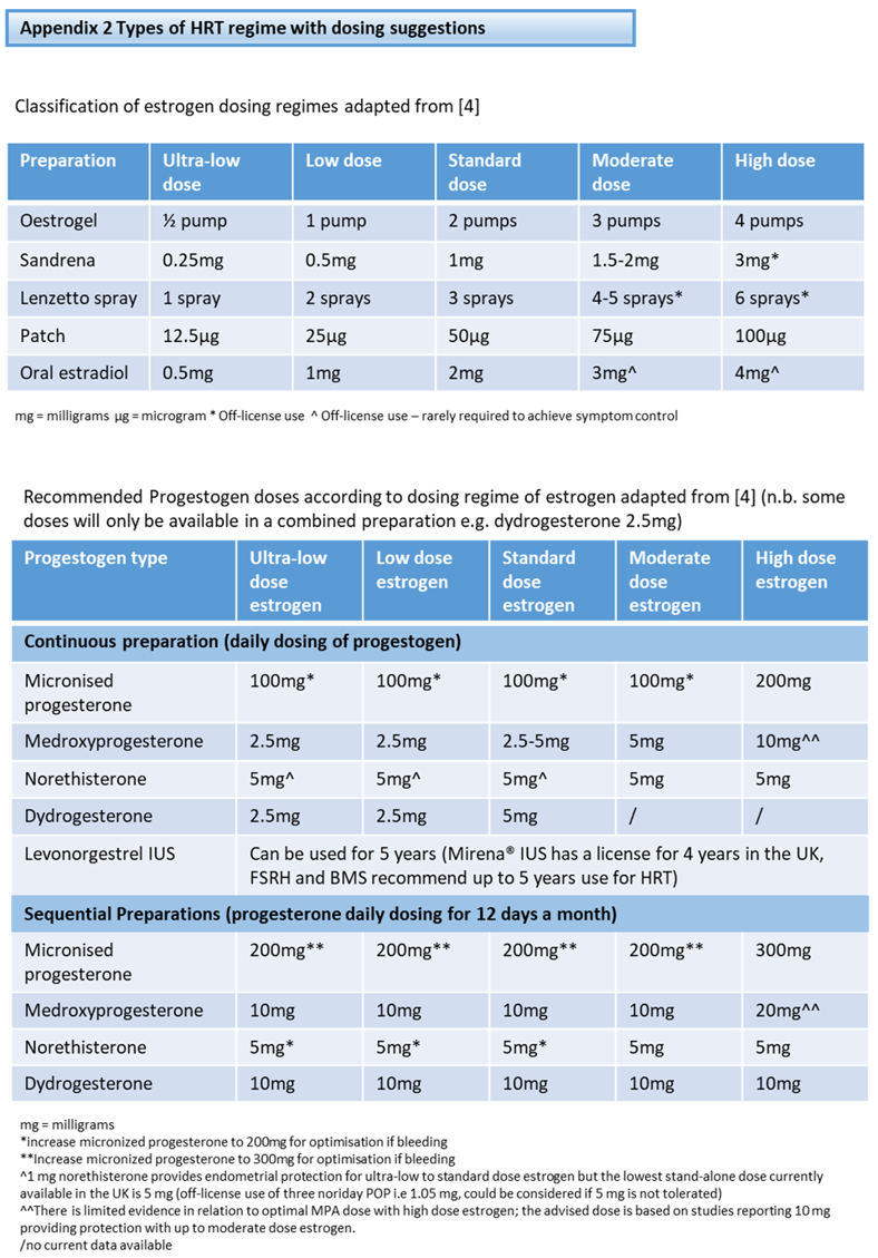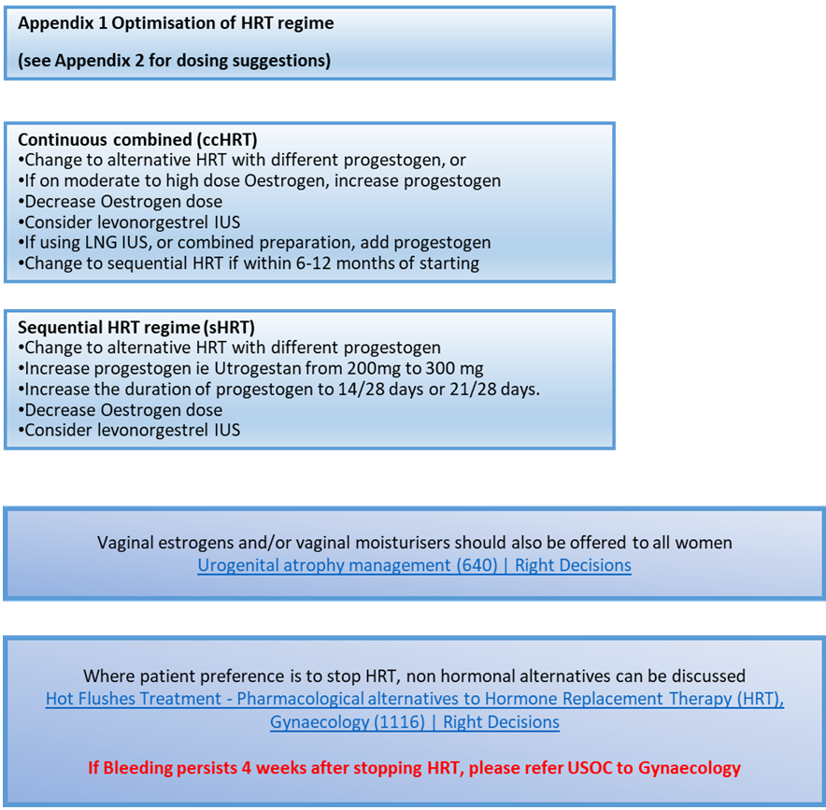 Where appropriate, some women may consider stopping HRT or having a trial of HRT optimisation using a different preparation or dosing regime for 6months (please see Figure 1 for suitable patient parameters and Appendix 1 and Appendix 2 for dosing suggestions for HRT optimisation).