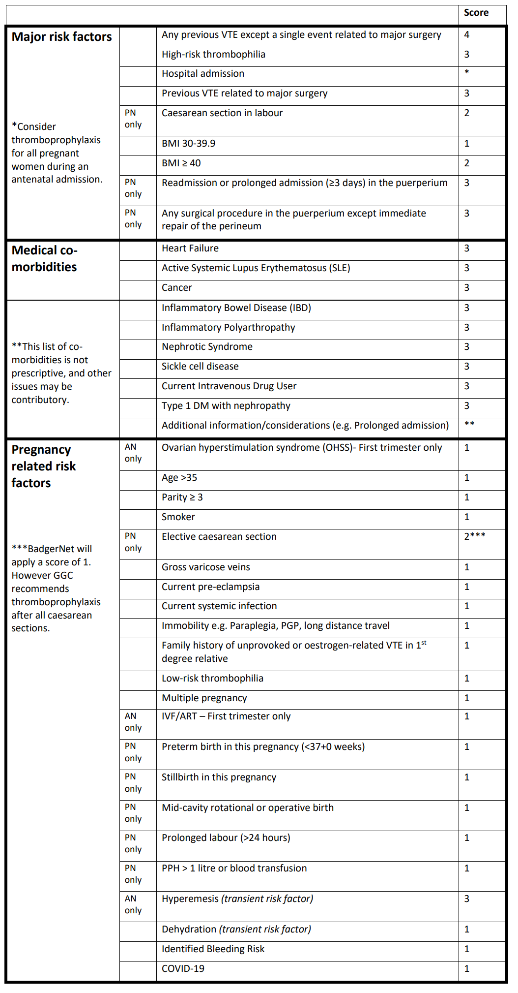Each risk factor is allocated a score between 1 and 4. The use of antenatal and postnatal thromboprophylaxis will depend on the total risk score as follows: