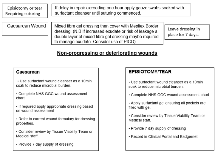 - Informing women of the wound dressing protocol in the event of a caesarean birth and informing of appropriate wound care post caesarean birth/episiotomy/tear suturing.