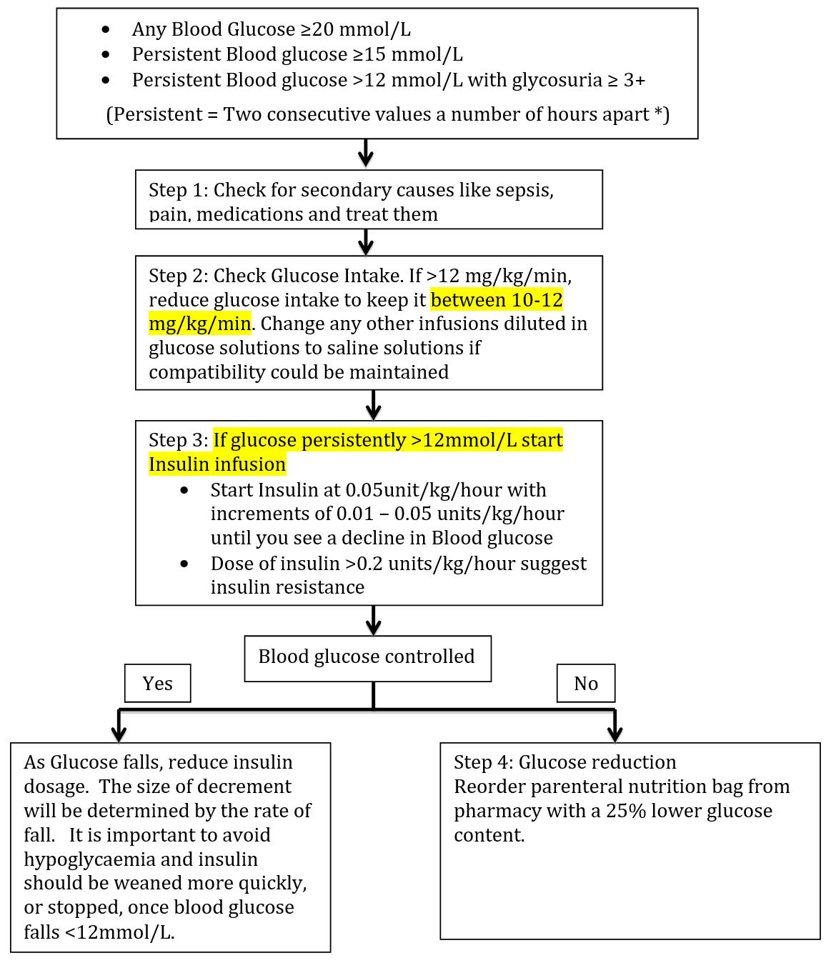 It should first be ensured that glucose infusion rates > 12 mg/kg/min is not being used, particularly where VLBW infants are requiring a high fluid intake to maintain hydration.  It is also pragmatic to ensure that unnecessary infusions of glucose are not being used e.g. medications diluted in Glucose rather than Saline.  If such simple measures do not control the hyperglycemia and blood glucose levels remain at or above the operational thresholds outlined above then further intervention is warranted.