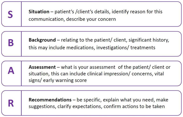 The SBAR communication tool is designed to structure information sharing between healthcare professions (NHSE&I 2021).