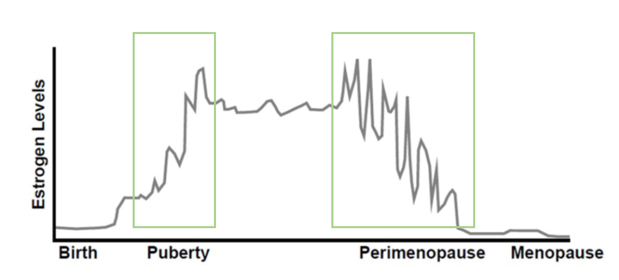 Oestrogen levels vary throughout a women’s life with greater fluctuations happening during puberty and the perimenopause.