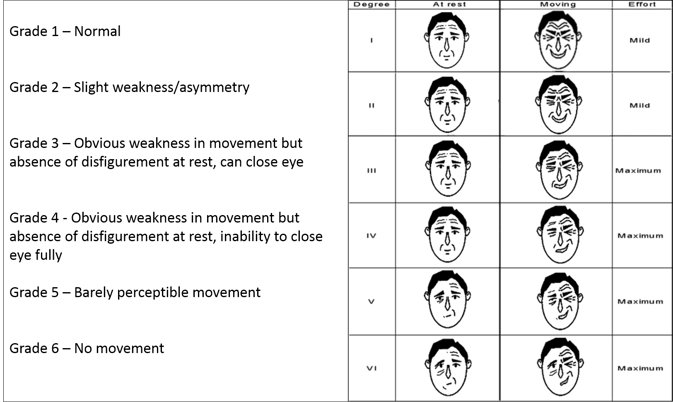 • Assess/document facial movement – eye closure/forehead movement, can use House Brackman Scale (see below)