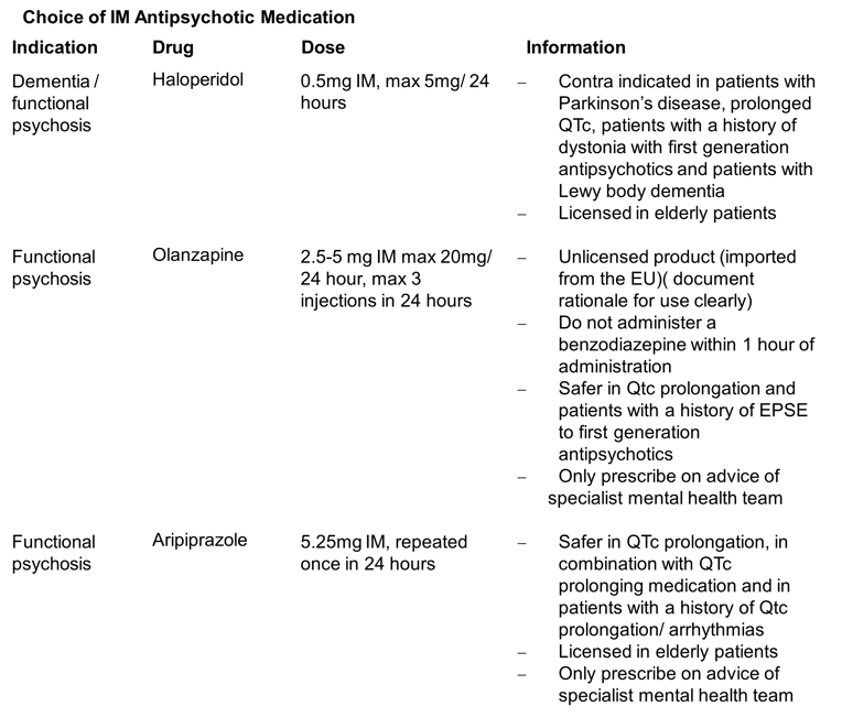 • Oral antipsychotic choice will depend on regular antipsychotic prescription and previous response to medication.