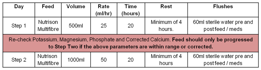 - Medical staff to check refeeding bloods (U&E’s phosphate and magnesium) before commencing NG starter regimen