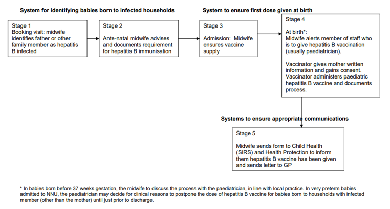 Your baby should have the first dose of vaccine soon after they are born. Your midwife will discuss this with you before the baby is born and make sure your baby gets the hepatitis B vaccine in hospital This starts to protect your baby when they are going home to a household where someone is carrying the hepatitis B infection. It is important that your baby receives their routine childhood immunisations at 8, 12 and 16 weeks in order to complete the course of vaccinations for hepatitis B.