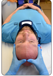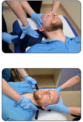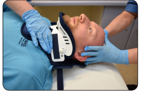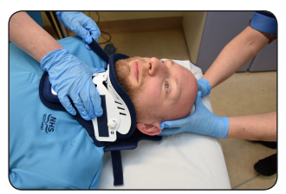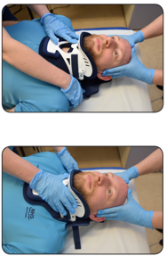 Before releasing the head hold, ensure the collar is symmetrical,    snug fitting and all the edges of the white hard collar are covered with the grey/blue pads to ensure it doesn’t rub the skin
