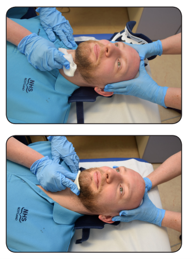 The Patient should be lying down in a straight line, on a flat bed and should be reminded to stay still whilst collar care is performed.