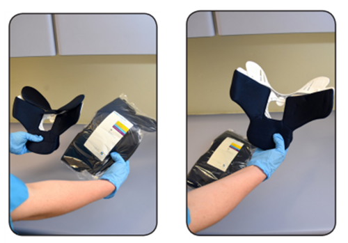 With the grey side of the pads facing out (pale blue side  towards patient’s skin) apply the pads and ensure there are no edges of the          plastic collar frame exposed