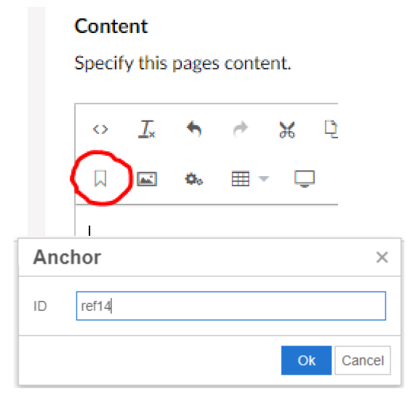 b. Highlight the content you want to link to, click on the anchor icon on the toolbar, then enter your ID tag. This will add an element containing that ID to the selected section of the page.