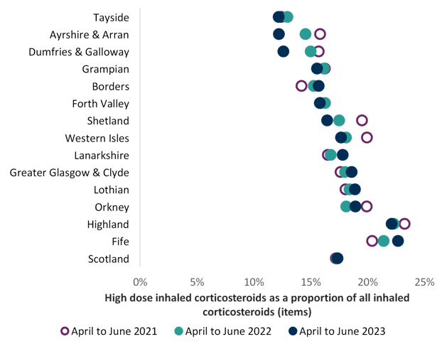High dose corticosteroid inhalers as a percentage of all corticosteroid inhalers items (using 2019 SIGN/BTS classification of high dose)