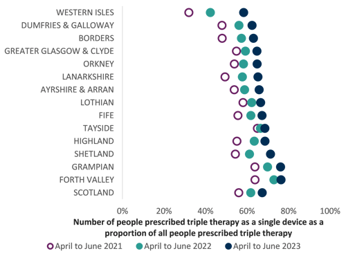 Number of people prescribed triple therapy as a single device as a proportion of all patients prescribed triple therapy