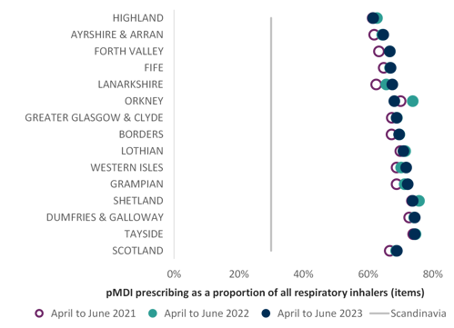 • The chart below shows the proportion of pMDIs dispensed as a proportion of all other inhalers (including dry powder inhalers and soft mist inhalers). As detailed above, the UK has a high proportion of pMDI use (70%) compared with the rest of Europe (< 50%) and Scandinavia (10–30%).75 The grey line on the chart indicates the Scandinavian level of pMDI prescribing at 30% as a comparator.