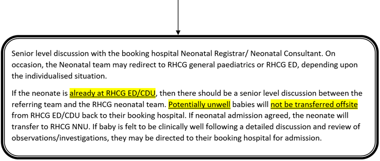 It is not possible to account for all clinical presentations and there will likely be neonatal patients that do not fit clearly into the pathway described in this document. In these circumstances a senior level discussion should occur between the referring team and the neonatal team, at least at Registrar or Consultant level. A conference call may be appropriate between referring team, general paediatric and neonatal teams. This can be arranged using the DECT phones or via Teams calls. It may be appropriate, in occasional circumstances, for the receiving team (neonatal or general paediatrics) to take the baby’s details from the referrer, coordinate discussions as to best place of care and contact the family directly with a plan. This is to avoid community based colleagues having to make multiple phonecalls between specialities when there is not a clear pathway agreed as to best location of care. Please ensure you take an accurate contact phone number for the referrer AND the family.