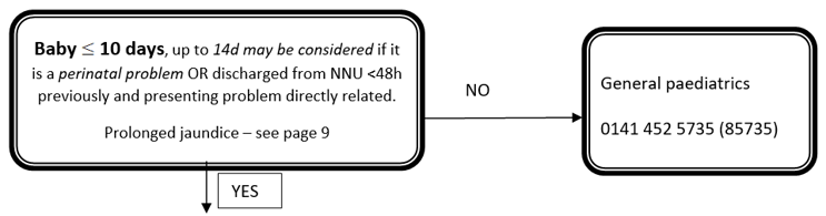 Referral for consideration of readmission, or acute review, to GGC Neonatal Services is only appropriate for neonates <10d of age, with a few exceptions as detailed below.   Babies that may be suitable for PNW or TC level care should be discussed with the neonatal team. Babies that may be unwell and not suitable for PNW/TC level care may be redirected to general paediatrics for discussion depending upon the clinical situation. Where there is concern about an infective cause for presentation, referral to neonatal services is not appropriate.