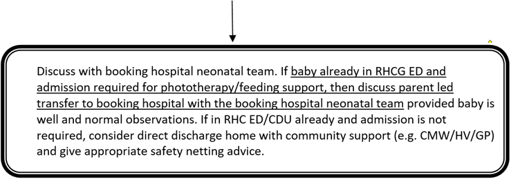 All prolonged jaundice (PJ) should be discussed same day with booking hospital neonatal team. Contact details as above. Guideline for managing prolonged jaundice Prolonged jaundice Neonates (NHSGGC) (scot.nhs.uk).