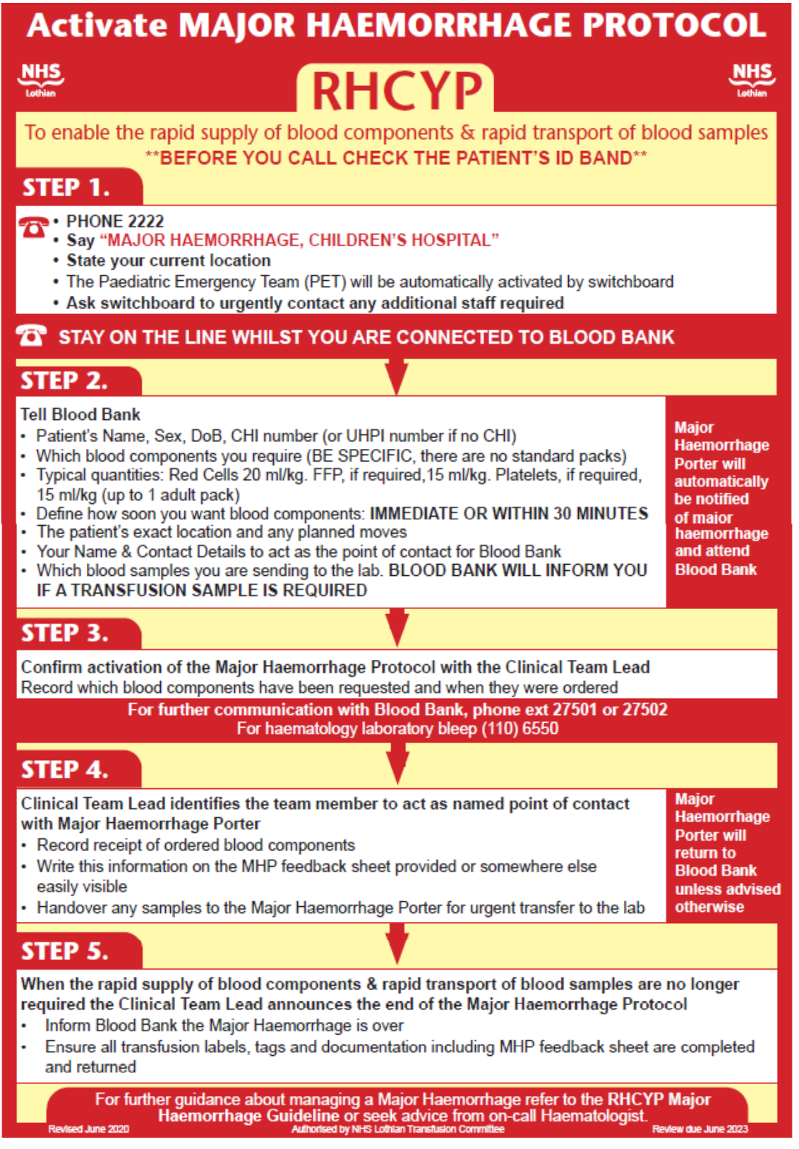 1. Phone 2222. State Code Red trauma call, Royal Infirmary of Edinburgh and state your current location and patient ETA. Stay on the line to be connected with the Blood Bank