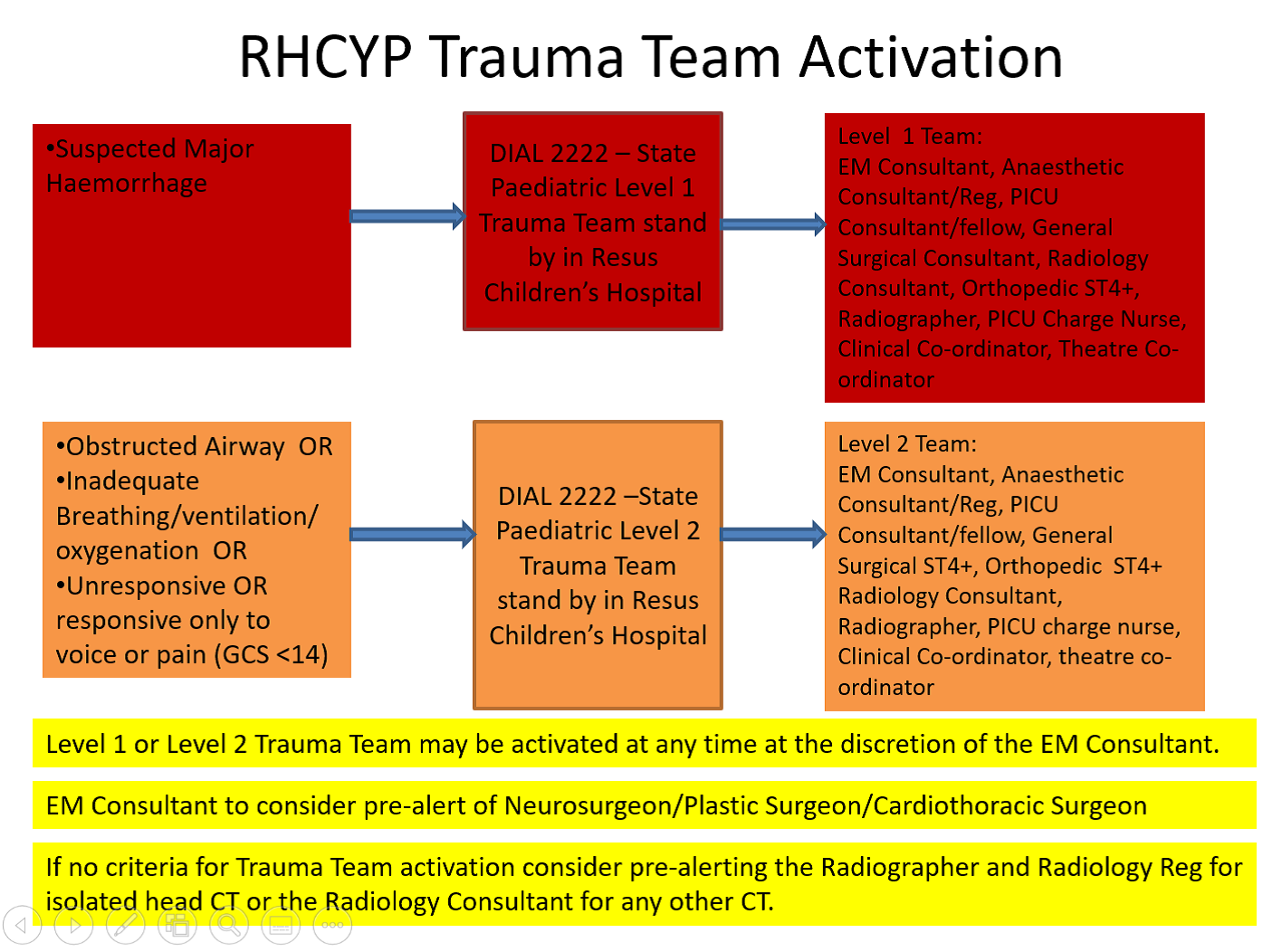 Trauma team activation protocol for the Royal Hospital for Children & Young People.