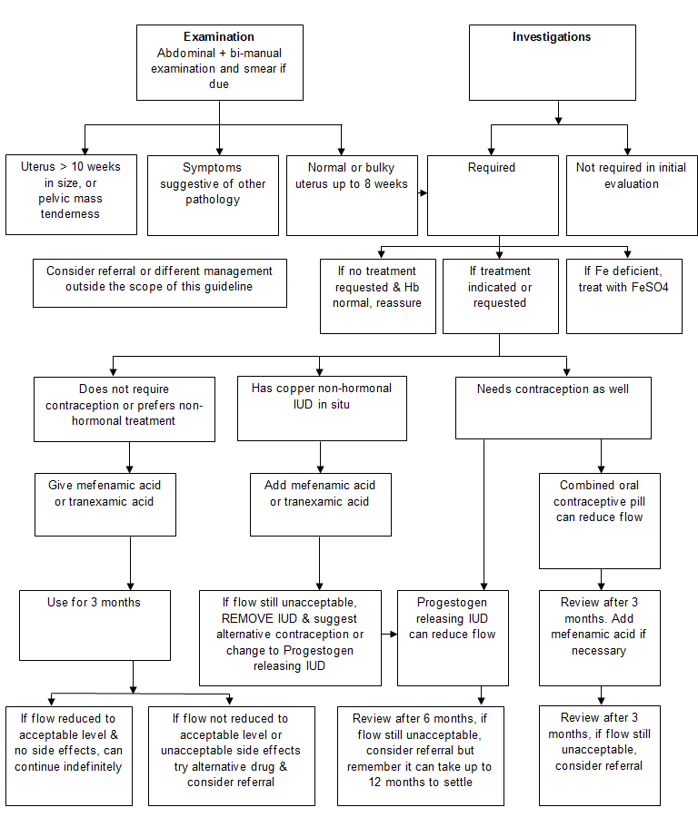 A history of heavy cyclical menstrual blood loss over several consecutive cycles without any intermenstrual or post coital bleeding, should be obtained.