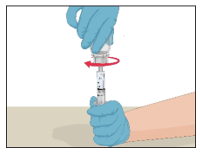 • Leaving the Prothromplex TOTAL vial (containing the reconstituted product) on your flat work surface, connect the syringe to the clear plastic connector and turn the syringe clockwise.