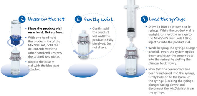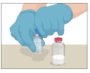 • Gently and continuously swirl the connected vials until dissolved or allow the reconstituted product to stand for 5 minutes then gently swirl to ensure the powder is completely dissolved.