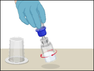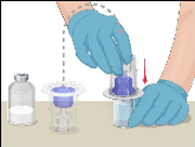 • Firmly insert the blue plastic spike of the device into the centre of the solvent vial stopper by pushing straight down. Grip the package at its edge and lift it off the Mix2Vial device.