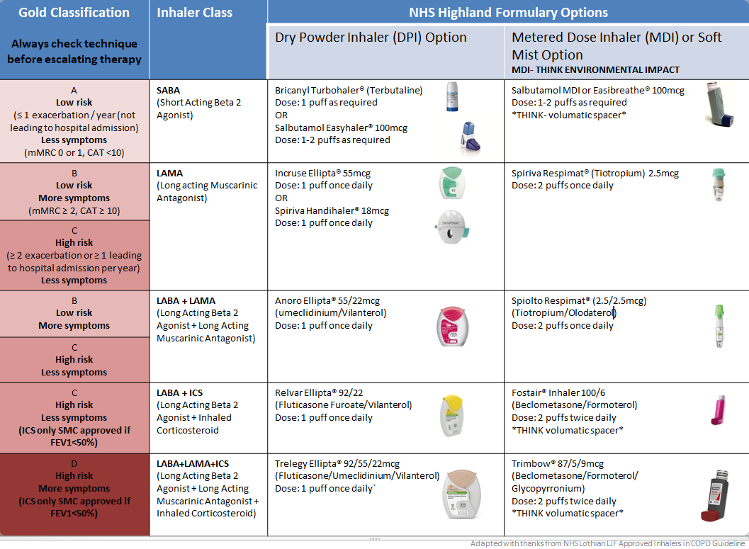 • Optimising their regular inhaled maintenance therapies and reviewing inhaler technique. If there has been an escalation in symptoms outwith the time they have had an acute exacerbation, or if they are having recurrent exacerbations consider if there is a need to change their regular inhaled therapy. See “Inhaled Therapy for COPD” for a clearer understanding of the different inhalers and options.
