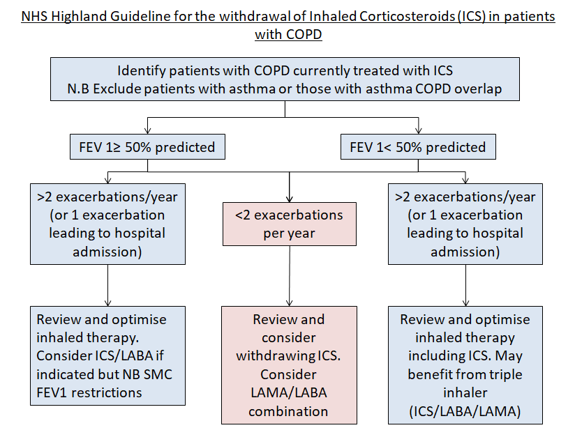 It may be appropriate in some cases to consider stepping down inhaled corticosteroid treatment, particularly in patients with previous pneumonia and those who are predominantly symptomatic but not exacerbating. This should be done cautiously, using the NHS Highland Guideline below for the withdrawal of Inhaled Corticosteroids (ICS) in patients with COPD.