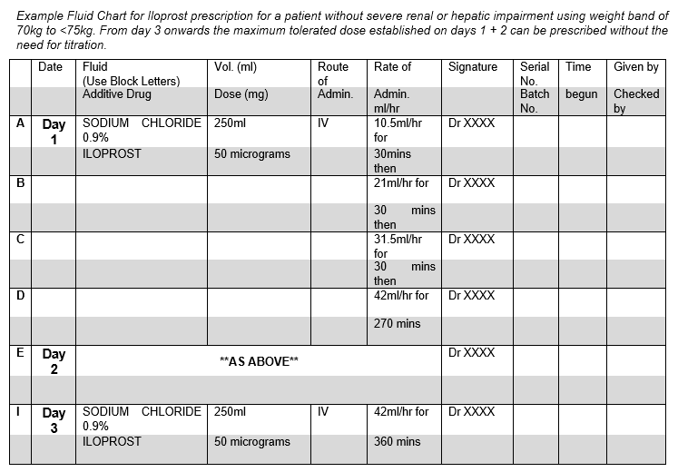 Iloprost should be prescribed and administered on the fluid chart and documented ‘as per fluid chart’ on the regular medications section of the prescription chart