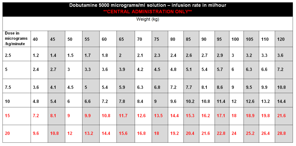 Dobutamine: CENTRAL administration (5mg/mL) (Critical Care Formulary)