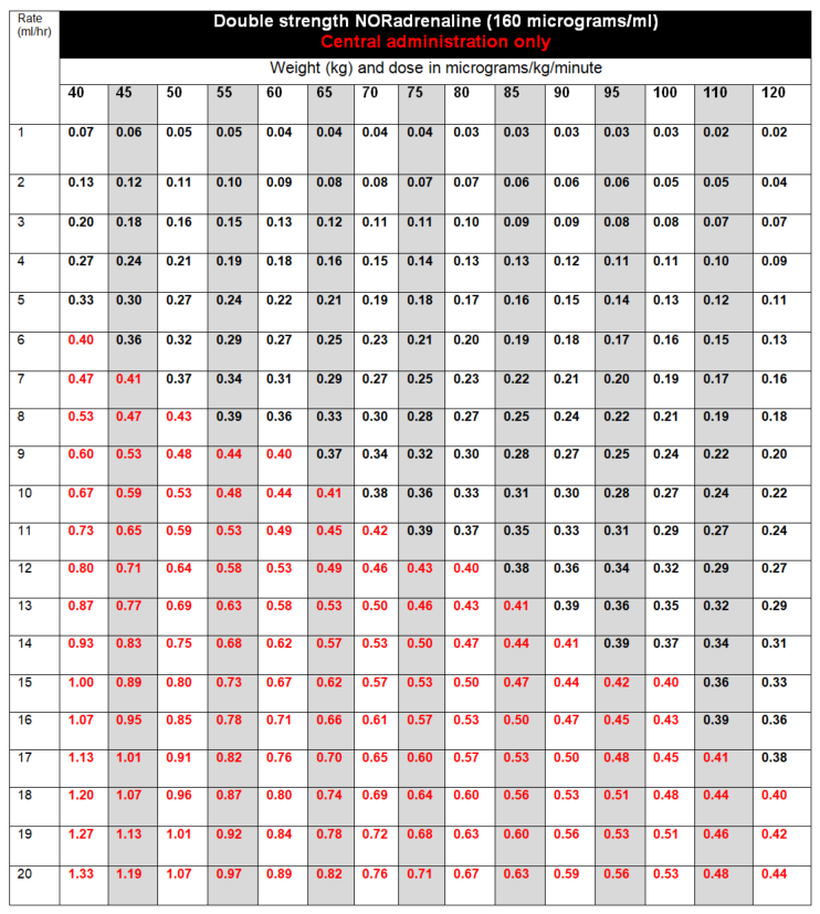 • For patients on high rates of quad strength noradrenaline, consider preparing in 100mL bag and giving via a volumetric pump.