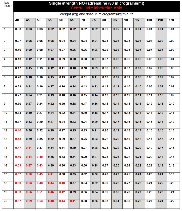 • If ready-to-use preparations unavailable, or preparing quad strength noradrenaline (16mg in 50mL, 320 micrograms/mL), dilute required volume of noradrenaline with glucose 5% to total volume and administer via syringe pump or volumetric infusion.