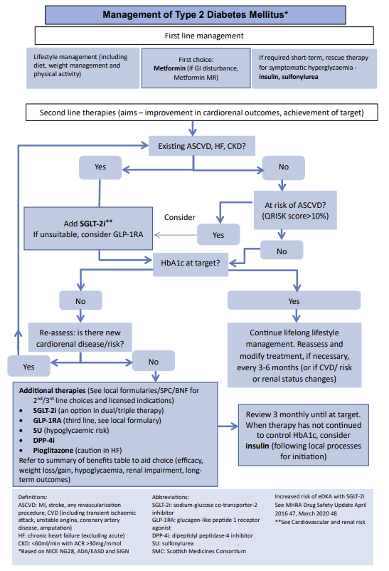 The prescribing pathway for the management of type II diabetes mellitus is presented below in a question and answer format.