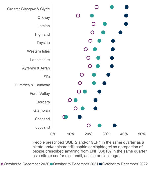 The NTI identifies individuals prescribed SGLT-2i and/or GLP-1RA in the same quarter as a nitrate and/or nicorandil, aspirin or clopidogrel as a proportion of people prescribed anything from BNF 060102 in the same quarter as a nitrate and/or nicorandil, aspirin or clopidogrel. This surrogate marker indicates there is a proportion of those with T2DM who may benefit from treatment with SGLT-2i or GLP-1RA, irrespective of glycaemic control.