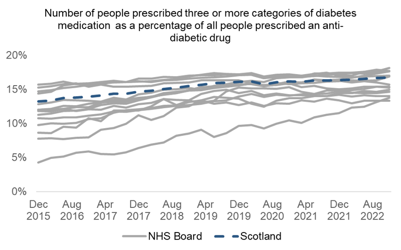 Variation between the national health boards is reducing. Boards should consider their position in this data and the steps required to ensure that polypharmacy in diabetes is appropriate. More information and details are available in using data to drive change and national therapeutic indicators and on the Public Health Scotland website.